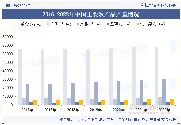 2022年,全国次要农区大部门时段光温水婚配优良,景象形象前提总体有益于粮食做物发展发育和产量构成,但夏日长江流域高温干旱,东北地域南部农田渍涝灾祸偏沉,对粮食出产形成必然影响。按照国度统计年鉴的统计口径,2022年我国粮食实现减产丰收,达68652。7万吨,比上年添加368万吨,减产0。5%,粮食产量持续8年不变正在1。3万亿斤以上。肉类、生果、禽蛋、水产物产量别离为9328。4万吨、31296。2万吨、3456。4万吨、6865。91万吨。
