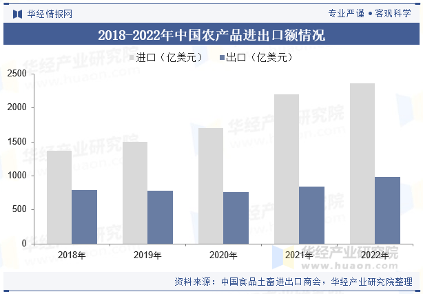 近年来,我国农产物商业总额呈上升趋向,特别农产物进口额上涨趋向更为显著。正在疫情影响最为严沉的2022年,农产物商业照旧连结快速增加态势。2022年,我国农产物进出口总额3343。2亿美元,同比增加9。9%,占我国外贸进出口总额5。3%。此中出口982。6亿美元,同比增加16。5%,占我国外贸出口总额2。7%;进口2360。6亿美元,同比增加7。4%,占我国外贸进口总额8。7%;商业逆差1378亿美元,比上年同期扩大1。7%。