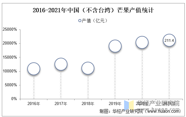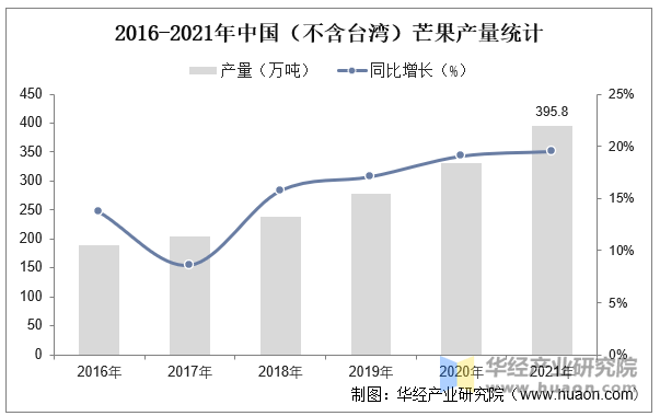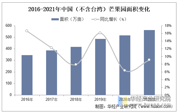 据农业农村部农垦局数据显示,2021年中国芒果园面积为561。9万亩,取2016年的344。7万亩比拟,中国芒果园面积增加了217。2万亩。2016年至2021年,中国芒果园面积同比增加率从峰值波动下降至9。09%。