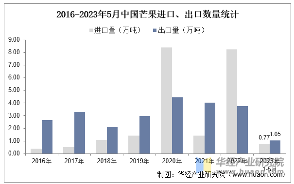2022年我国芒果的进口数量为8。23万吨,进口额为0。57亿美元;出口数量为3。77万吨,出口额为0。58亿美元。截至5月我国2023年芒果的出口数量为1。05万吨。