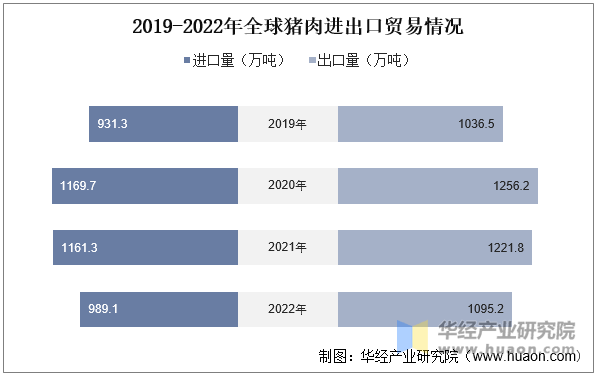 从进出口商业环境来看,近年来全球猪肉进出口规模全体呈增加的态势。据材料显示,2022年全球猪肉进口量为989。1万吨,同比下降14。8%;出口量为1095。2万吨,