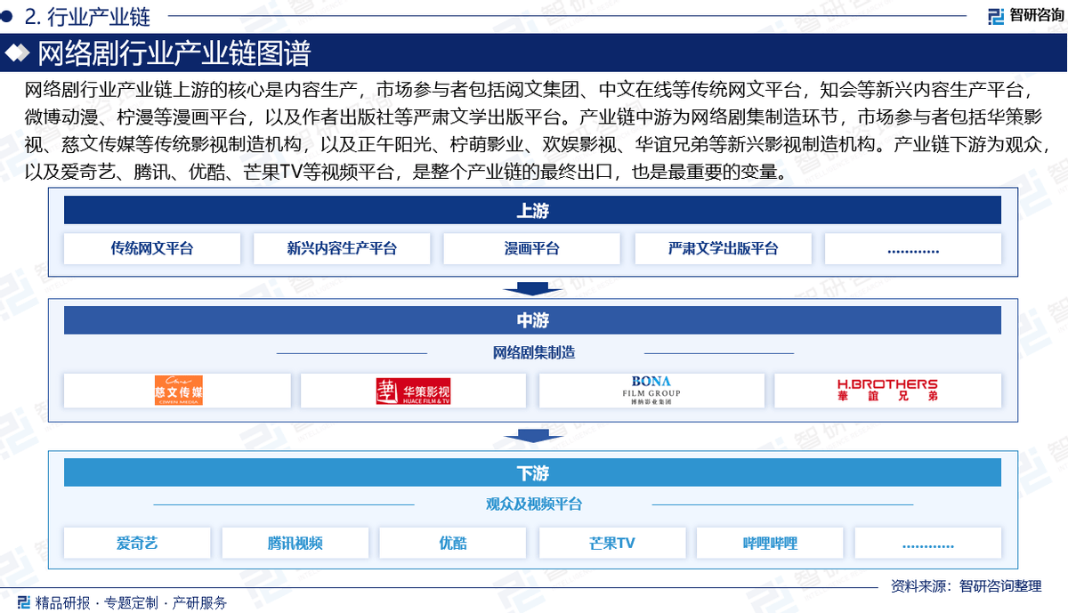 收集剧行业财产链上逛的焦点是内容出产,市场参取者包罗阅文集团、中文正在线等保守网文平台,知会等新兴内容出产平台,微博动漫、柠漫等漫画平台,以及做者出书社等庄重文学出书平台。财产链中逛为收集剧集制制环节,市场参取者包罗华策影视、慈文传媒等保守影视制制机构,以及正午阳光、柠萌影业、欢娱影视、华谊兄弟等新兴影视制制机构。财产链下逛为不雅众,以及爱奇艺、腾讯、优酷、芒果TV等视频平台,是整个财产链的最终出口,也是最主要的变量。
