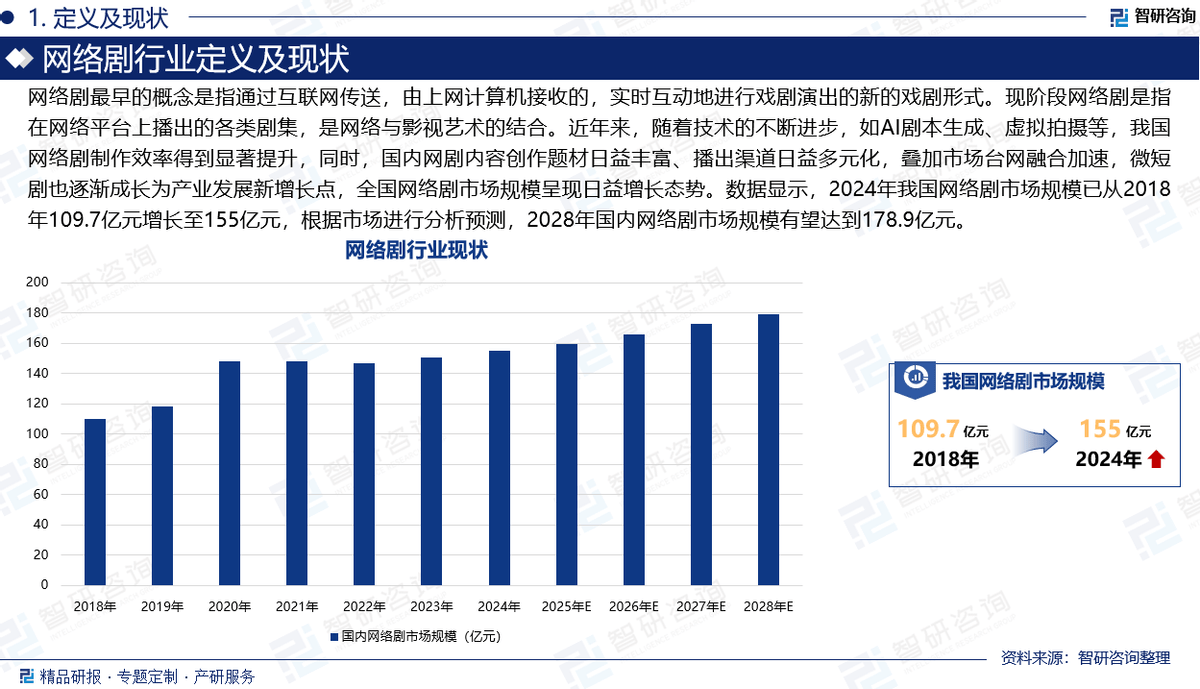 收集剧最早的概念是指通过互联网传送,由上彀计较机领受的,及时互动地进行戏剧表演的新的戏剧形式。现阶段收集剧是指正在收集平台上的各类剧集,是收集取影视艺术的连系。近年来,跟着手艺的不竭前进,如AI脚本生成、虚拟拍摄等,我国收集剧制做效率获得显著提拔,同时,国内网剧内容创做题材日益丰硕、渠道日益多元化,叠加市场台网融合加快,微短剧也逐步成长为财产成长新增加点,全国收集剧市场规模呈现日益增加态势。数据显示,按照市场进行阐发预测,2028年国内收集剧市场规模无望达到178。9亿元。