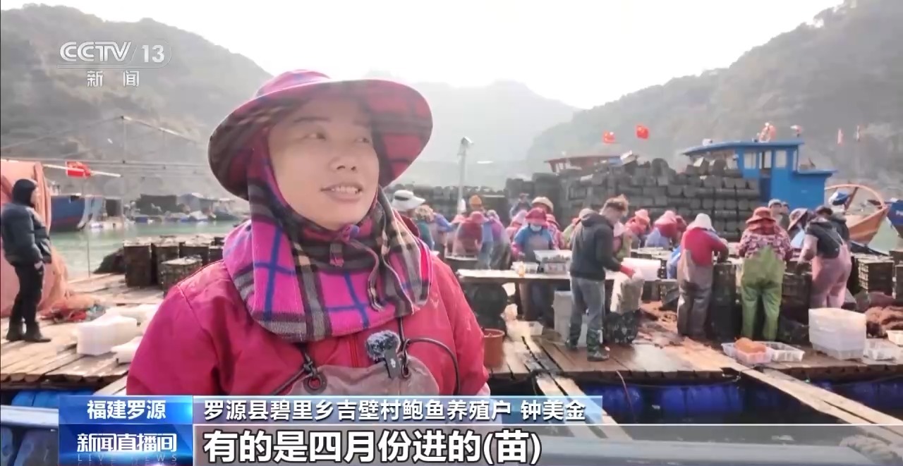 罗源县碧里乡吉壁村鲍鱼养殖户 钟美金:大号曾经卖了,现正在卖二号三号的。就是客岁的三月份,有的是四月份进的苗,现外行情会好卖一点,价钱还能够。