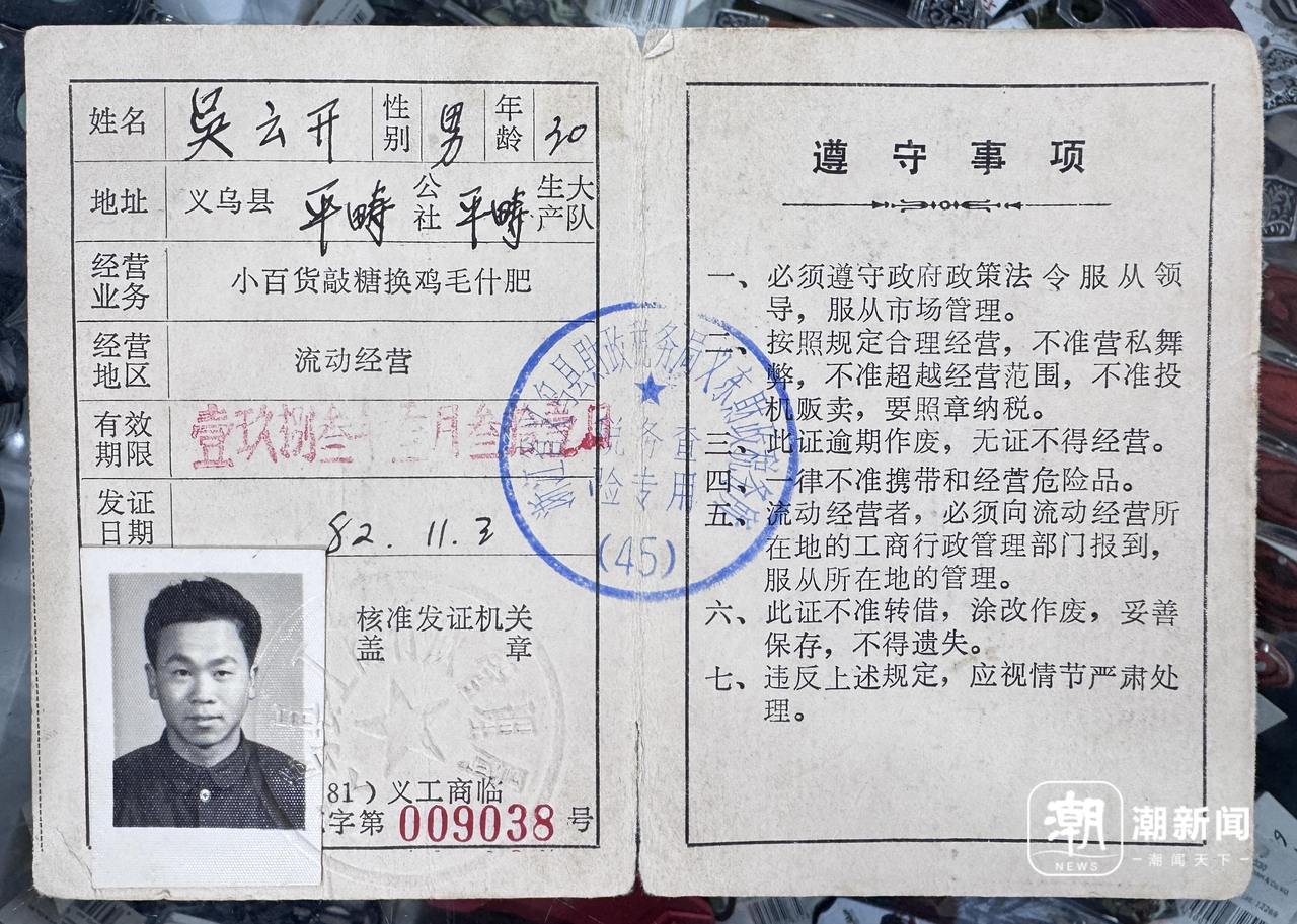 义乌,位于浙江中部,是一座既不靠山又不临海的小县城。20世纪70年代,“七山二水一分田,粮食高产贫穷县”“一条马七盏灯,一个喇叭响全城”就是昔时义乌的实正在写照。“那时候义乌穷啊,地盘里长不出什么庄稼,穷得吃不上饭,义乌人嫁女儿都是要嫁到江西或者福建等地。”吴云开回忆起以前的岁月甚是感伤。20世纪70年代末,跟着大门初启,穷得“客岁总盼本年好,本年又是破棉袄”的义乌农人怀着脱贫致富的强烈希望和感动,沉拾“敲糖帮”的“鸡毛换糖”经商保守,小商品市场雏形初现。话语间,吴云开从腰间掏出一个信封,里面拆着一个特殊的证件,一份1982年11月3日义乌县工商行政办理局颁布的“小百货敲糖换取鸡毛什肥”姑且许可证。吴云开保留得很好,其时的他方才30岁,证件上的口角照片还显得有些青涩。